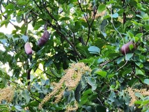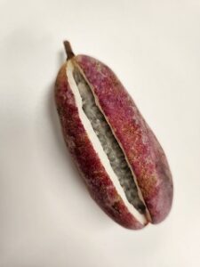 紫色の厚い皮の内側に種が沢山ある甘い果肉があり、