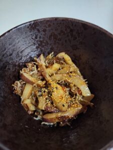 食感は、火を通したリンゴのような感じでしょうか…。フキノトウのように匂いの主張が強いわけでは無いので、じゃこなどと合わせるのが良いでしょう。一日置いた方が味がしみて美味しい気がします。