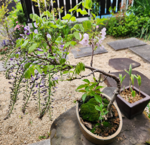 ひとつの鉢に藤と桜が同居しています。
